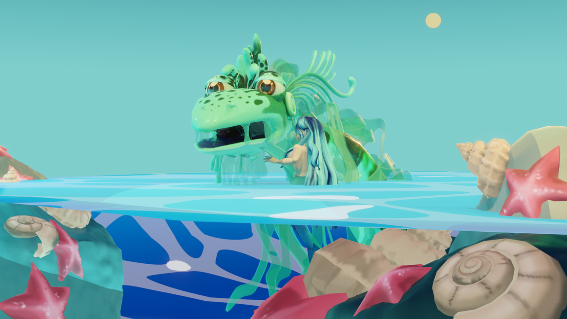 The sea serpent in this short is a huge and semi-sapient creature with a goofy, slightly Kermit-esque face and several facial and body fins. His design was based on James C. Christensen's illustrations of the creature from his book Voyage of the Basset, which was a beloved tome in my household growing up. I was always very drawn to this creature design, with its big, half-lidded and slightly lazy gaze, drippy shape language and slightly gummy-looking texture, so it was my big project in May of 2024 to model it from scratch with only the book's illustrations as a guide. I built his rig by hand and spent hours painstakingly adding seams to all those fins I booled on him.